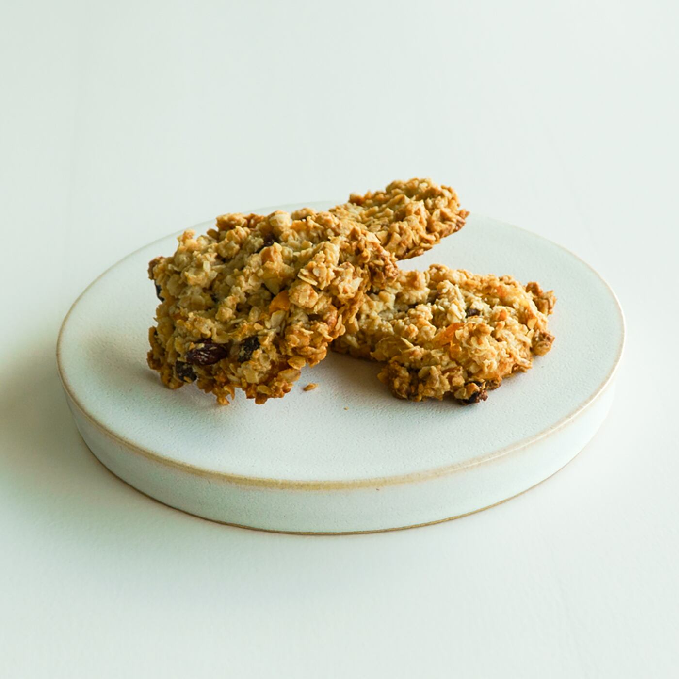 オートミール、太白ごま油、メープルシロップ、薄力粉、ココナッツファイン、カシューナッツ、レモンピール、ドライクランベリー、豆乳、きび糖、洋酒、塩